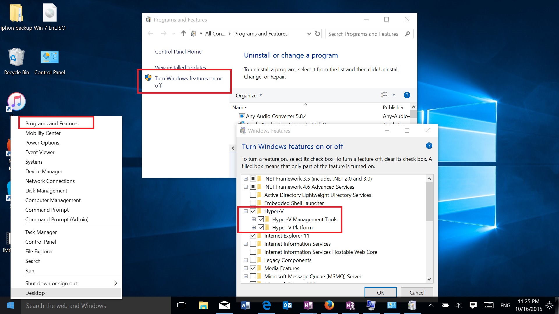 ولتفعيل الخاصية قم بالضغط بزر الفأرة اليمين على قائمة إبدأ ثم اختار Programs and Features بعد لك اضغط على Turn Windows Features on or off ثم ضع علامة صح علىHyper-V ثم اضغط موافق بعد ذلك سيطلب منك إعادة تشغيل الجهاز