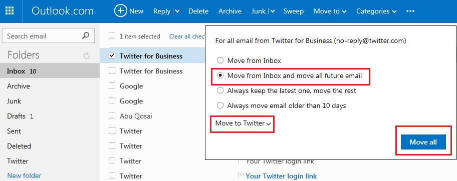 - إختر نقل من الـInbox ونقل حتى الرسائل المستقبلية ثم اختر مجلد تويتر, بعد ذلك اضغط على Move all